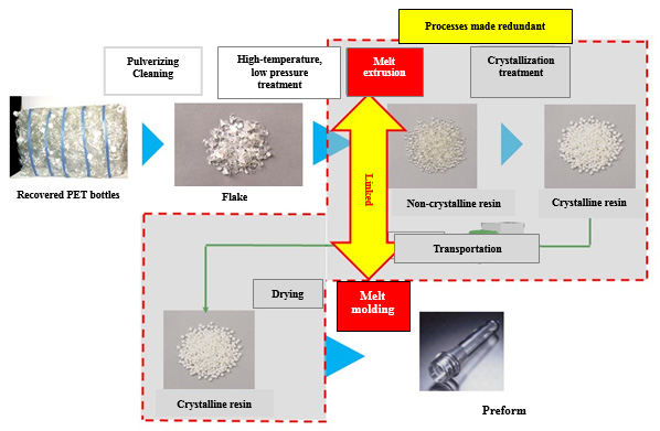 A technology in which “flake” created by pulverizing and washing recovered PET bottles is treated at high temperature and low pressure for a fixed period and that, after being melted and filtered, enables the preform to be manufactured directly. In order to form preforms of uniform quality, it is important to pour the melted flake into the molding machine at a constant pressure, and the development of this technology involved putting up actual facilities and verification over a protracted period of time. In comparison to the previous setup, which required a large number of processes leading up to the manufacture of the preform, such as crystallization and drying, it is estimated that reductions*1 in CO2 emissions of approximately 25% will be possible.