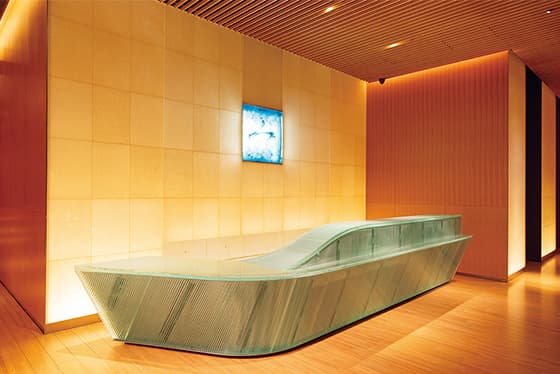 The museum design was entrusted to the noted architect, Kengo Kuma, who has sought to create the comfortable ambiance of an “urban living room,” a space characterized by tranquility and comfort, drawing inspiration from “Japanese Modern” while fusing Japanese traditional with contemporary values. The exterior is covered by vertical louvers made of white porcelain and lending a sense of transparency. Interior finishes use both wood and traditional washi (Japanese paper), creating the natural warmth for which Japan is noted, while admitting a soft light. The flooring used throughout the museum is white oak from recycled whiskey barrels.