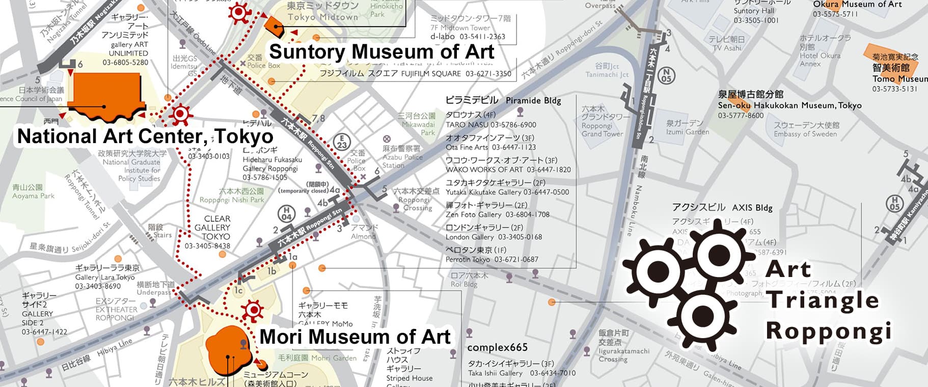 The Art Triangle Roppongi Map, which shows the three museums and other art-related spots in Roppongi, is available at our museum and other locations in Roppongi. Why not follow the map and enjoy an art stroll through Roppongi?